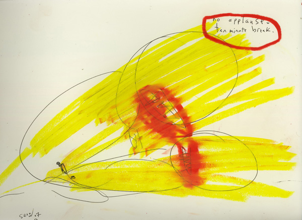 "No applause, ten minute break", 9"x12" ink/watercolor/acrylic/mix on bristol paper